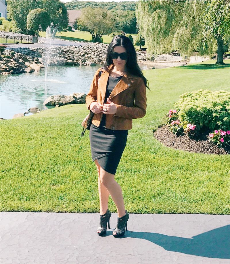 As the leaves begin to change and the temperatures drop I can pair it with a cute pair of booties and this gorgeous Blank NYC suede jacket I purchased from the Nordstrom Sale this year. This is the perfect date night outfit. I can also just throw on a jean jacket or even a blazer if I am going into the office.