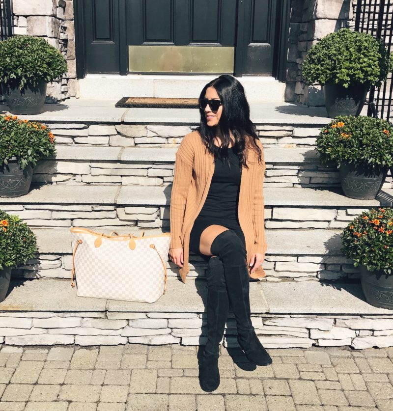 Connecticut winters are freezing cold so come December/ January I will be wearing it with this cozy cardigan and these dreamy over the knee suede boots by Stuart Weitzman. Yes they are expensive but let me just tell you they are SO worth it! I purchased them last year and have worn them a ton.