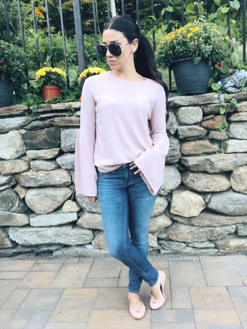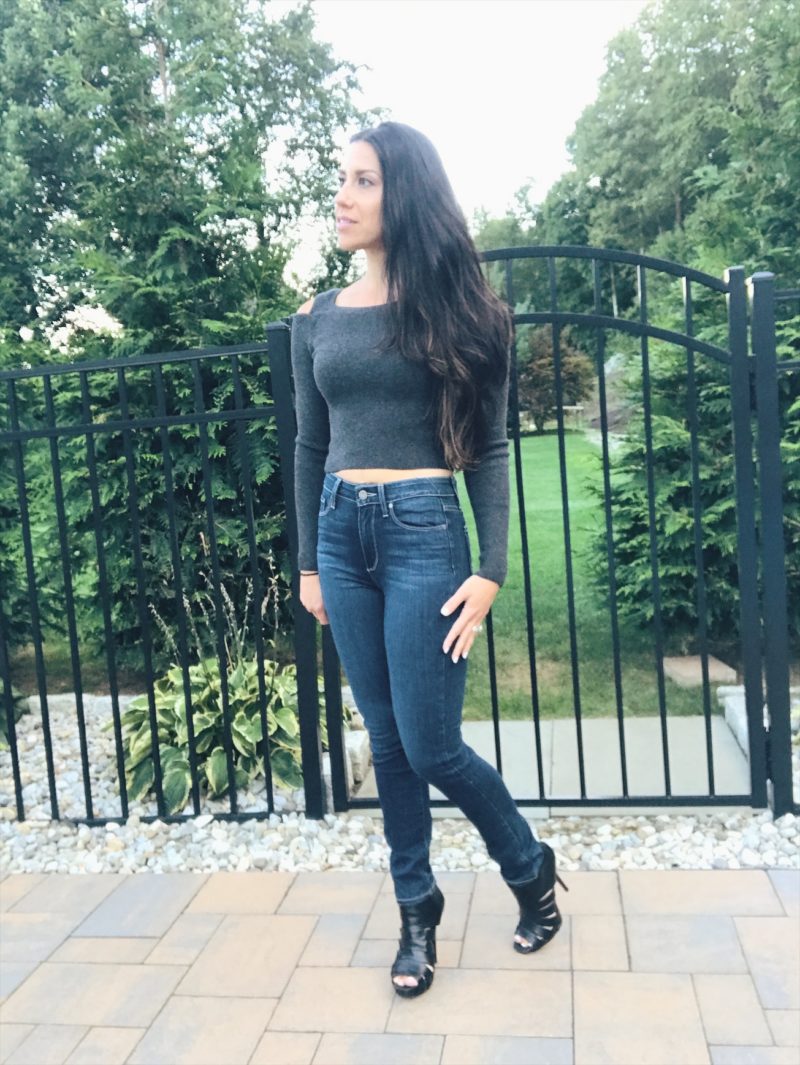 This style of jean would have to be my favorite, I just love a dark jean for the fall, and the high waist is so flattering. They hold you in and elongate my petite 5’2″ frame. Above I am wearing these from Paige but also love these from Express. I usually pair it with a cropped, ribbed sweater but you can wear them with any top you want. These have a skinny leg which is great to wear with a pair of over the knee boots too.