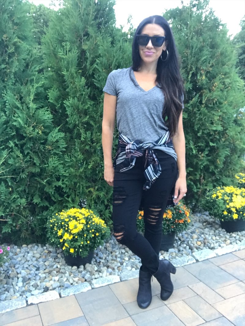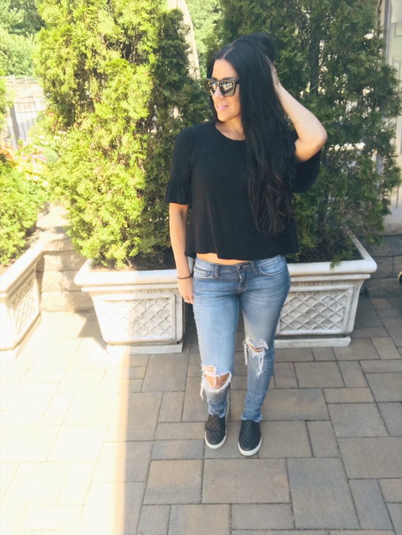 Distressed jeans and frayed hems are everywhere this year. They are a great weekend, running around jean. They can be edgy looking so I paired them with a girly, ruffle sleeve tee and a slip on sneaker to tone it down a bit. These are SO comfortable and only $58!