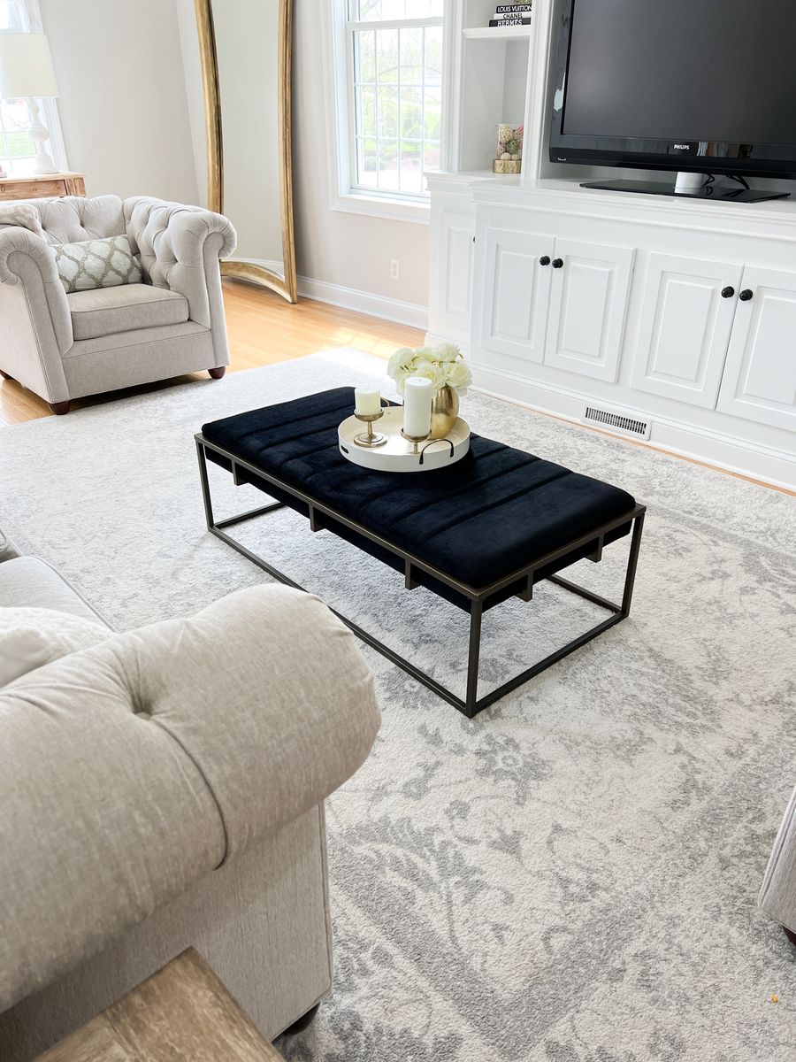 Neutral living room decor inspo, including my ottoman coffee table from Amazon!